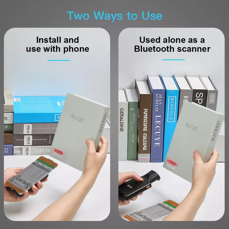 【Two Ways to Use】: You can use it as a back clip barcode scanner to fixed on the phone, or you can use it alone as a normal Bluetooth barcode scanner.