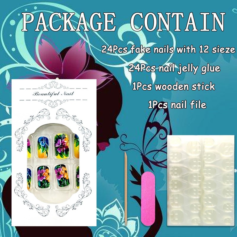 - Package: You'll get 24 french false nails in 12 sizes. 1 mini nail file, 1 small wooden stick, 1 piece of nail glue sticker. Glue on nails are perfect for most people's nails