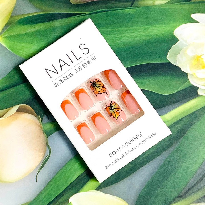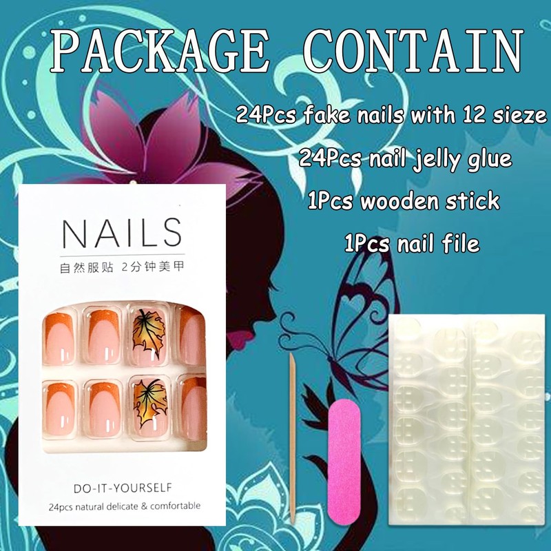 - Package: You'll get 24 fall maple leaf false nails in 12 sizes. 1 mini nail file, 1 small wooden stick, 1 piece of nail jelly sticker. Glue on nails are perfect for most people's nails