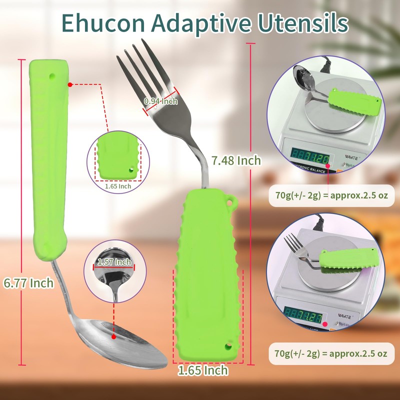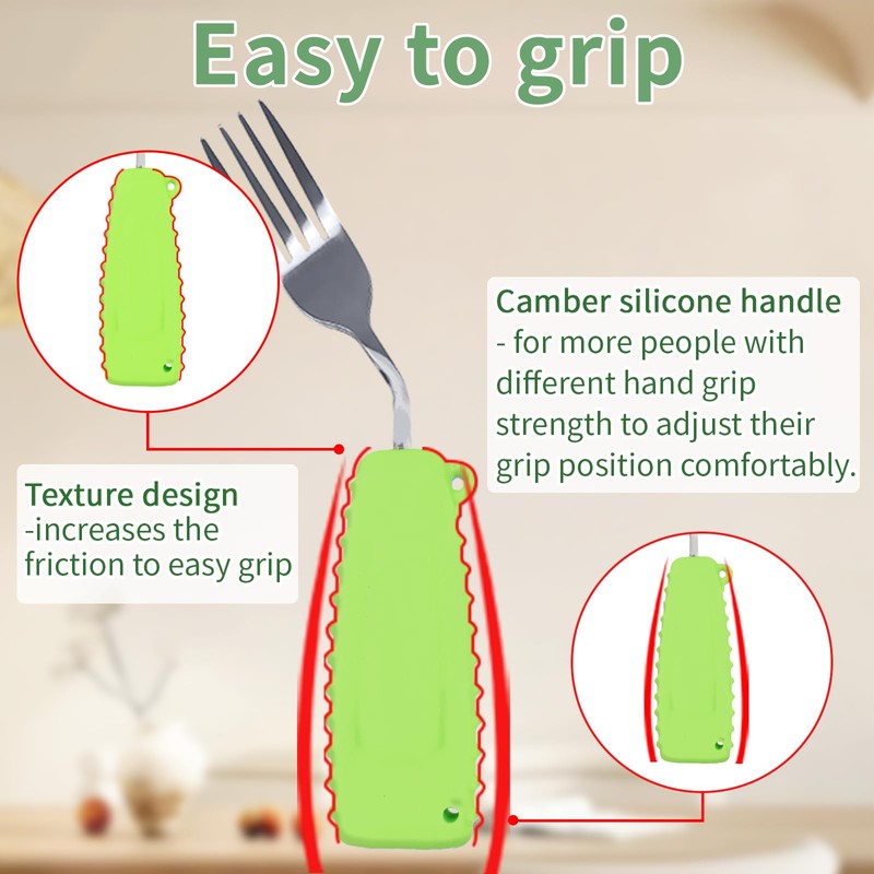 - Vibrant Colors: The large, easy-to-grip silicone handles of the Parkinsons utensils are designed with vibrant colors to increase appetite. And we offer purple and green adaptive angle spoon and fork color options.