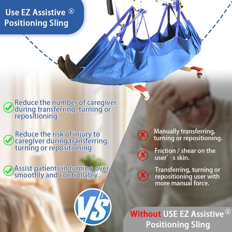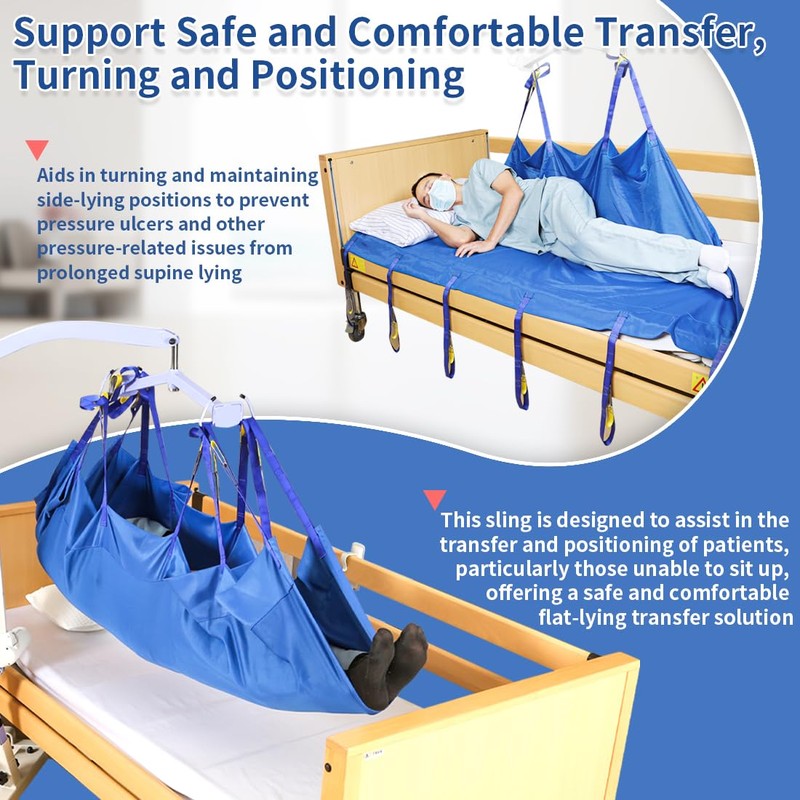 - Design Purpose: EZ Assistive repositioning patient lift sling is specifically engineered for patients in a state of unconsciousness, paralysis, or prolonged bedridden conditions, aiming to achieve safe and comfortable horizontal transfers. Moreover, position lift sling Provides full body support for lateral supine transfers, repositioning and turning in bed, effectively preventing pressure sores and alleviating physical stress from extended periods of lying down