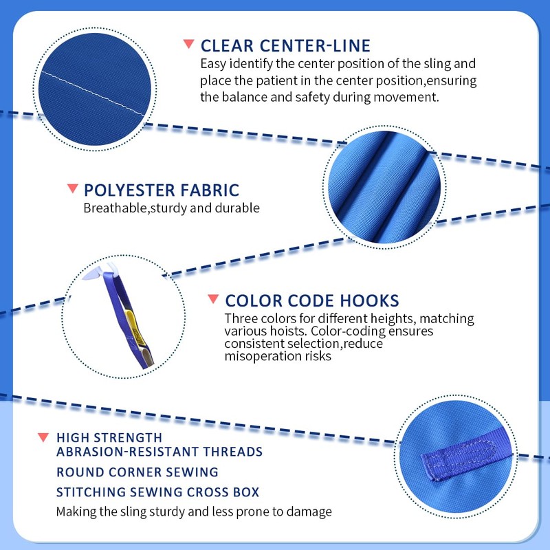 - Colorful Webbing Loop Design: Multiple webbing loops on the sling for hoyer lift accommodate various user repositioning and transfer tasks. Additionally, the webbing loops are color-coded, allowing caregivers to quickly identify the matching colors on both sides of the lifting sling during care operations and correctly connect these loops to the lifting hoist machine, ensuring the height and balance of the connection between the full body patient lift sling for repositioning and the lifting hoist. This prevents tilting or slippage during lifting and transfer, thereby guaranteeing the safety of the user