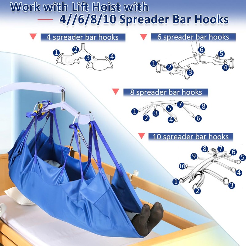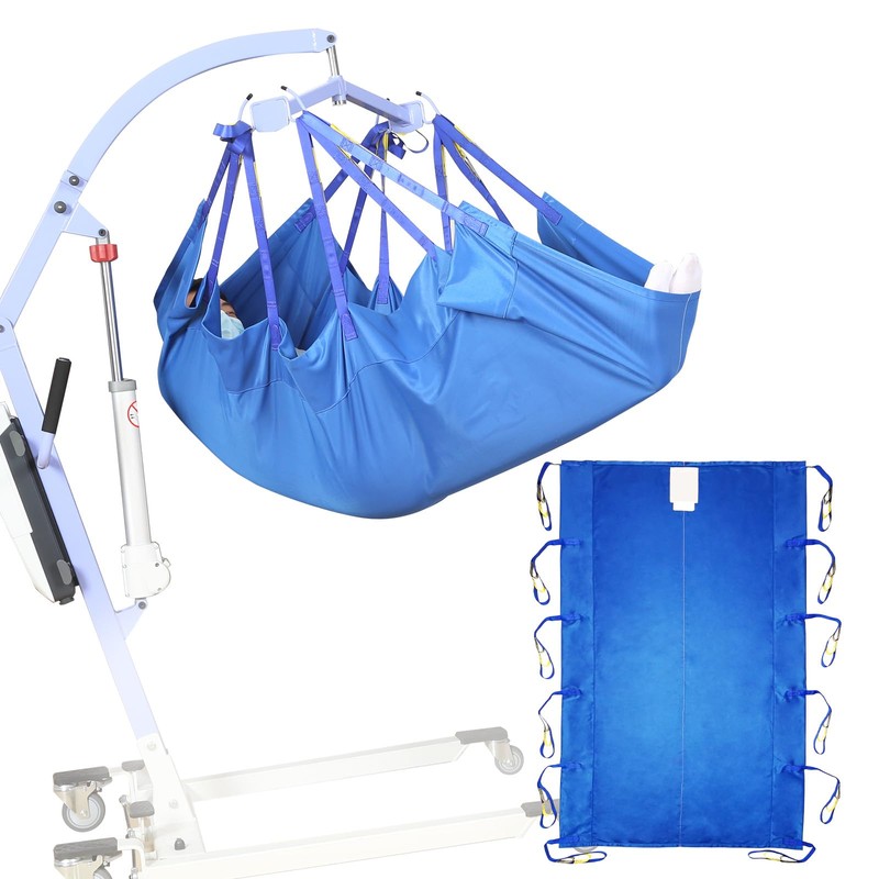 - Dimensions and Handles: This hoyer lift sling features 12 handles and spacious dimensions (74 inches long, 42 inches wide), fully enveloping the patient's body and evenly distributing pressure during movement, ensuring comfort and convenience for the patient while significantly reducing caregiver strain, thus ensuring both comfort and safety