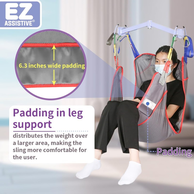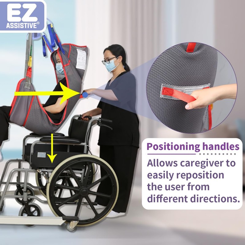 The EZ Assistive Full Body Patient Sling adopts a four point mesh sling design, specially designed for transferring bedridden patients, elderly,disabled and can support up to 500 LBS (230 KG). The patient sling is equipped with four lifting points, which are compatible with most floor and ceiling lifts and can be used without any additional chains or straps. The full body patient sling makes it easy to transfer patients. Whether transferring patients from bed to a wheelchair, lounge chair, sofa, bathtub or shower seat, or from the floor to bed, this patient lift sling can easily and comfortably transfer patients from point A to point B. The back of the sling is specially sewn with handle to ensure their correct and safe positioning during the transfer process.The lift sling is an excellent care products made of breathable and quickly drying mesh material. This mesh sling for showering, with its lightweight and breathable characteristics, allows air to circulate freely, providing users with more comfort, without feeling stuffy when worn.The patient transfer sling is machine washable, easy to clean and durable, and can be used in damp or dry environments.The EZ Assistive Full Body Patient Sling is an excellent elderly assistance products for any patient that requires safe and efficient transfer. It provides a comfortable and safe solution for transferring patients.