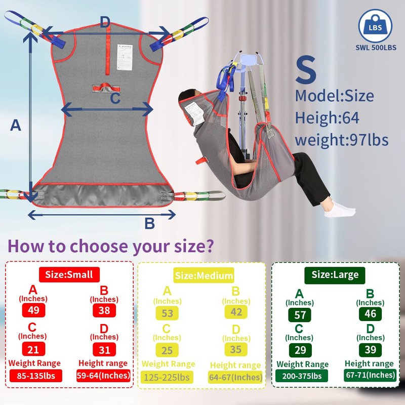 - 【Weight capacity】The transfer sling body with reinforced structure supports up to 500 lbs.After undergoing rigorous testing,this toilet sling can pass both dynamic testing (500 lbs, 500 lift cycles) and static testing (750 lbs, 20 minutes) for safe workloads after 10 wash cycles.The lift sling can withstand repeated use and maintain its structural integrity, making it a reliable tool for home medical and elderly assistance products.