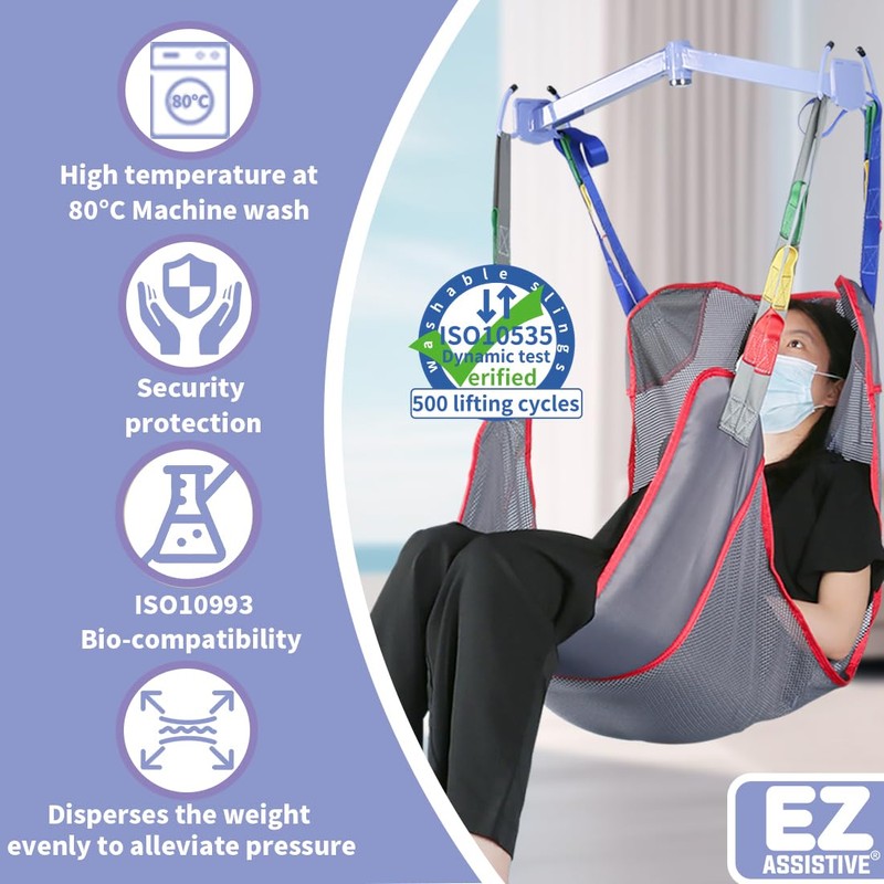 - 【Lift & Reposition & Transfer】The EZ Assistive Full Body Patient Sling is designed to assist in lifting, transferring, and repositioning patients or loved ones. The sling is made of sturdy fabric and excellent craftsmanship, which is durable, safe and comfortable. The lift sling suitable for various scenarios such as beds, wheelchairs, toilets, showers, or chairs. Whether in hospitals, rehabilitation centers, or home care.