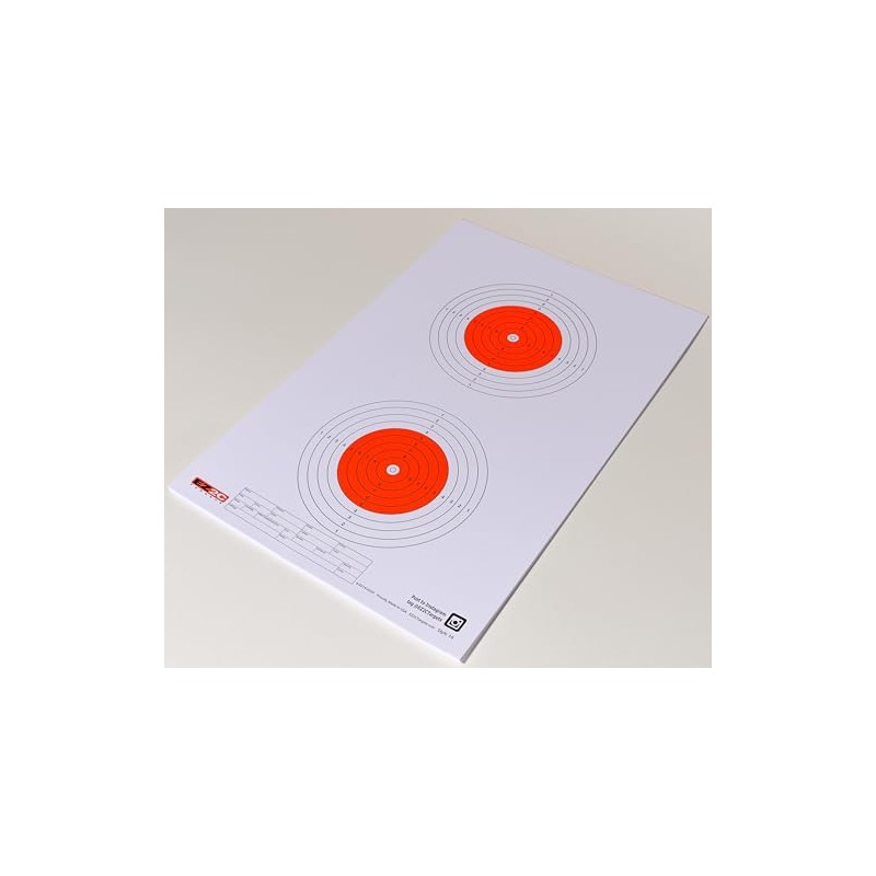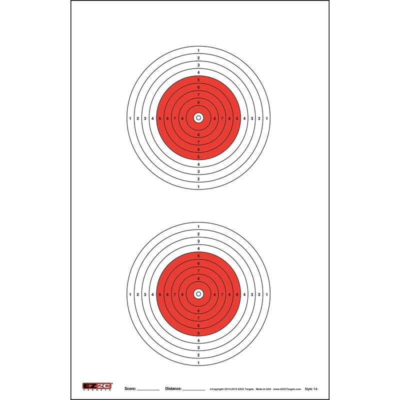 EZ2C is proud to manufacture this 50 meter target for air rifle enthusiasts. This style features two 6.1" (155 mm) targets. Be sure to keep score with your rounds, every ring has a 1 through 10 point value. You shoot the top target, your competitor shoots the bottom. If they hit your target, be sure to thank them for the extra points! Targets are on 11" x 17" High-Quality Bright White Paper. They are Conveniently Packaged with 25 targets per Pad.