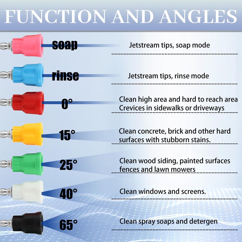 - 7 Versatile Spray Patterns: This set includes 7 power washer nozzle tips with different spray modes: 0°, 15°, 25°, 40°, rinse, and soap. Whether tackling stubborn grime or cleaning delicate surfaces, these nozzles provide the flexibility you need for any task.