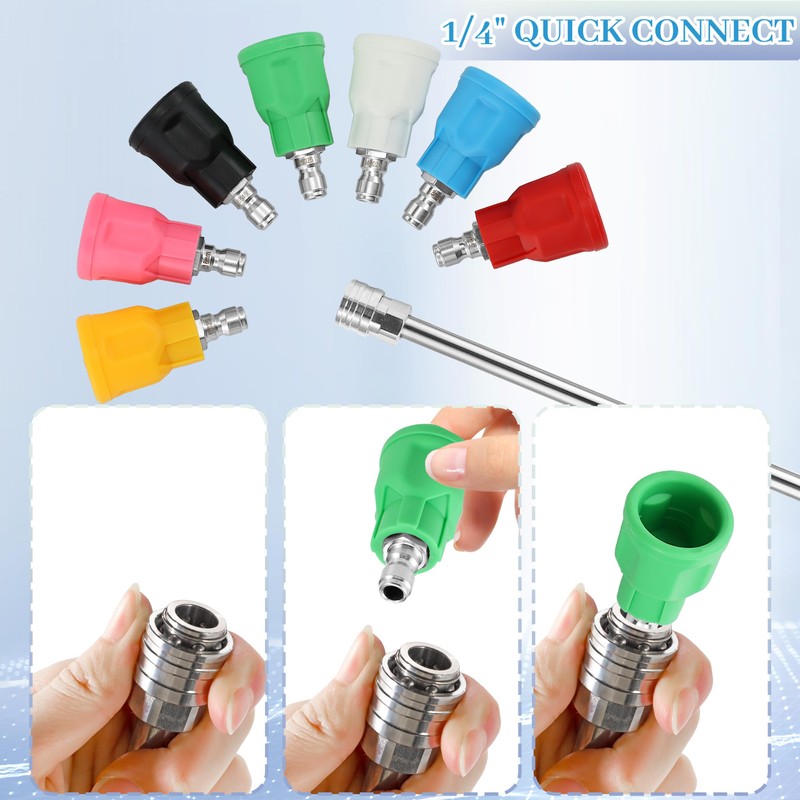 - Quick-Connect Compatibility: The 1/4" quick-connect design ensures a secure, leak-free connection and is compatible with most pressure washer wands and guns. The pressure washer tips set saves time and effort, making cleaning tasks easier and more convenient.