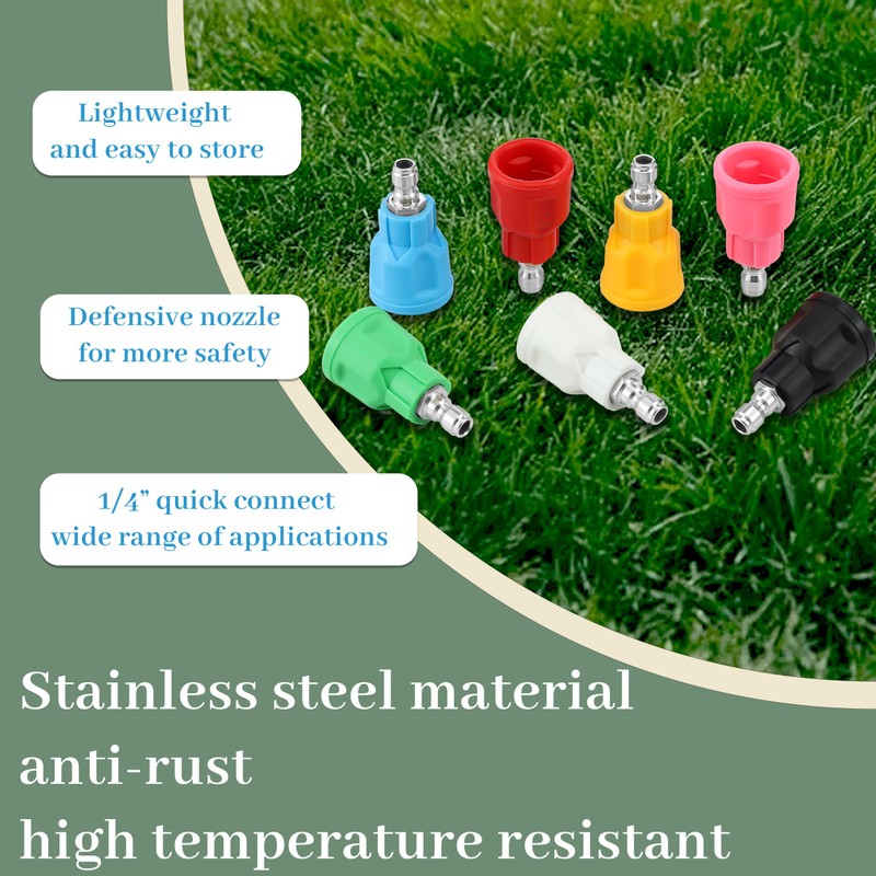 Durable & Rust-ResistantMade from premium stainless steel with a lightweight silicone casing, these pressure washer nozzle tips are resistant to rust, heat, and freezing temperatures. The durable materials ensure a long service life, while the compact design makes them easy to carry and store.