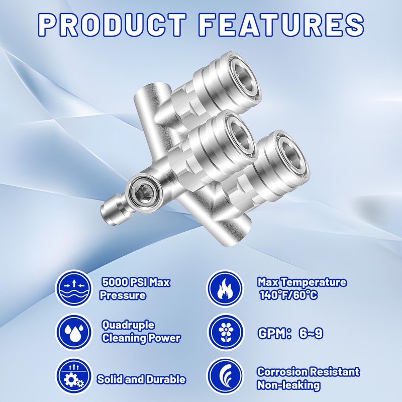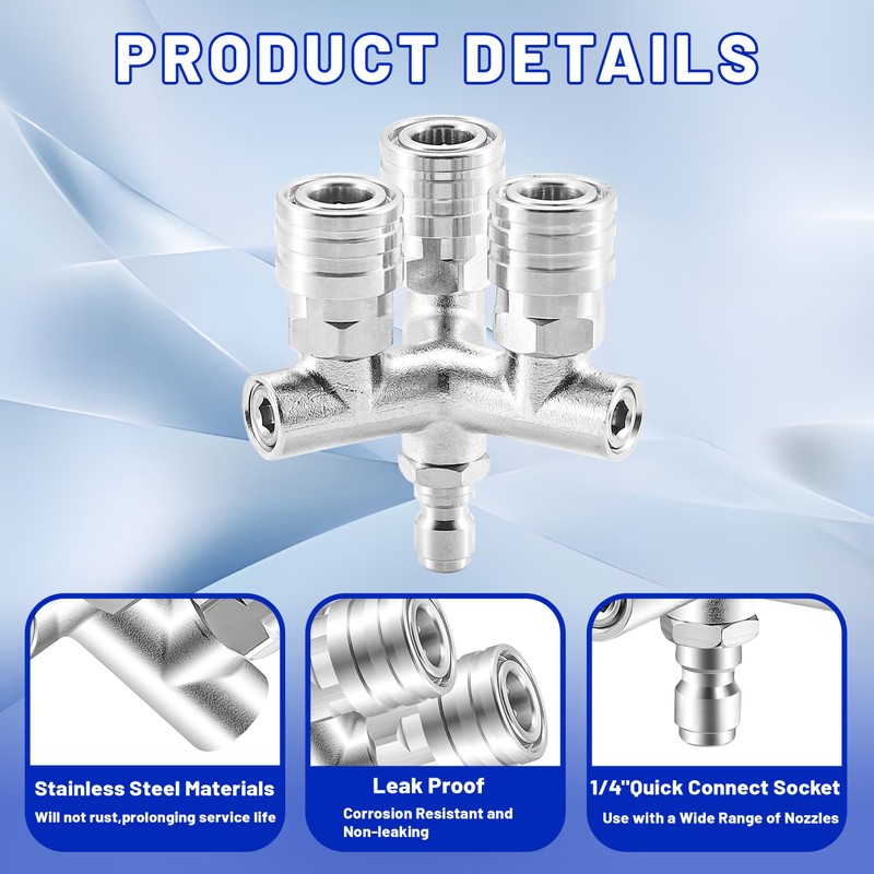 Triple Cleaning Efficiency:The upgraded pressure washer triple nozzle allows you to attach three nozzles simultaneously, delivering 3× the cleaning power. With increased spray coverage and water output, it expands your cleaning range and boosts efficiency, making tough tasks faster and easier.Exceptional Performance:The high-pressure washer tips are made of high-quality stainless steel, which is strong, corrosion-resistant, heat-resistant and leak-proof. With a max pressure of 5000 PSI and temperature resistance up to 140°F (60°C), this nozzle ensures durability and reliable performance in extreme conditions.Versatile Applications:This 3 in 1 pressure washer nozzle also includes three nozzles with spray angles of 0, 15, 25, and 40 degrees for your selection, allowing you to tackle various cleaning tasks. Easily switch between concentrated spraying and wide coverage to meet your diverse cleaning needs.Quick & Convenient Connection:Equipped with a 1/4-inch quick-connect fitting, this pressure washer nozzle allows for fast and secure attachment to most pressure washer guns and wands. It supports multi-angle cleaning and is compatible with standard 1/4-inch color-coded nozzles.Package Includes:1 × Triple Pressure Washer Nozzle;3 × 0° Red Nozzles;3 × 15°Yellow Nozzles;3 × 25°Green Nozzles;3 × 40°White Nozzles;EZALOR specializes in durable, high-performance pressure washer tools designed to handle any cleaning challenge with ease and efficiency. Trust EZALOR for quality you can rely on.