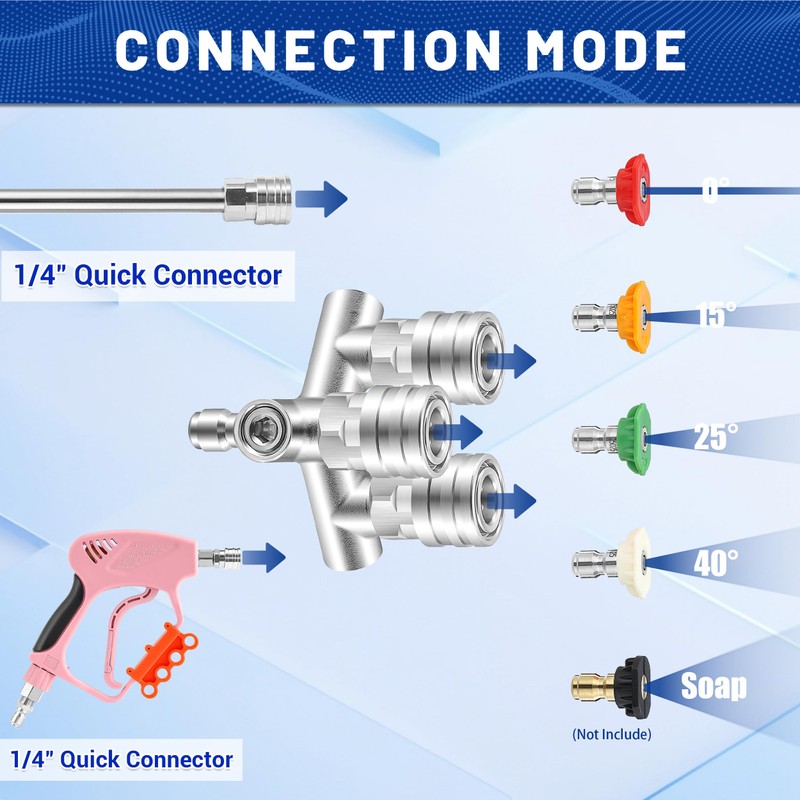 - Quick & Convenient Connection: Equipped with a 1/4-inch quick-connect fitting, this pressure washer nozzle allows for fast and secure attachment to most pressure washer guns and wands. It supports multi-angle cleaning and is compatible with standard 1/4-inch color-coded nozzles.