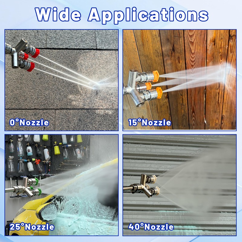 - Versatile Applications: This 3 in 1 pressure washer nozzle also includes three nozzles with spray angles of 0, 15, 25, and 40 degrees for your selection, allowing you to tackle various cleaning tasks. Easily switch between concentrated spraying and wide coverage to meet your diverse cleaning needs.