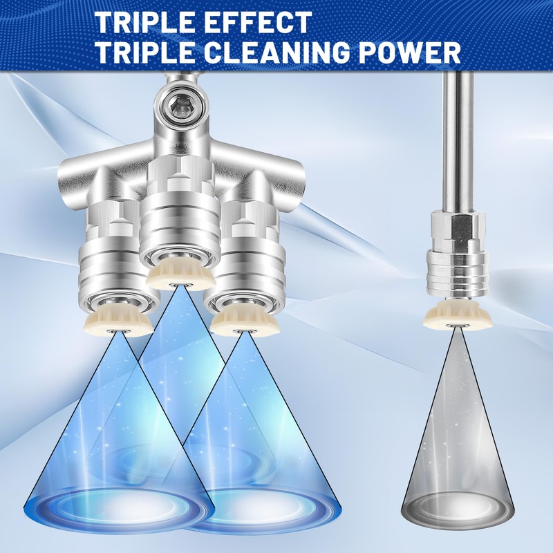 - Triple Cleaning Efficiency: The upgraded pressure washer triple nozzle allows you to attach three nozzles simultaneously, delivering 3× the cleaning power. With increased spray coverage and water output, it expands your cleaning range and boosts efficiency, making tough tasks faster and easier.