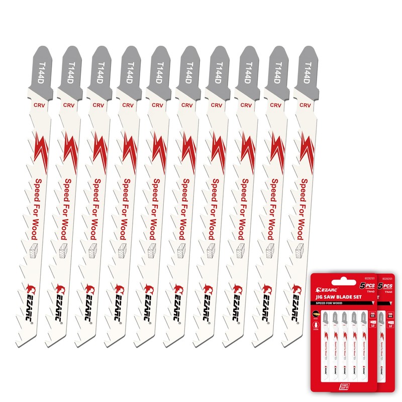 EZARC 10-Piece Jigsaw Blades T144D for Fast Wood Cutting, 6TPI T-Shank Jigsaw Blade Set Made of CRV, Curved and Wavy Cutting