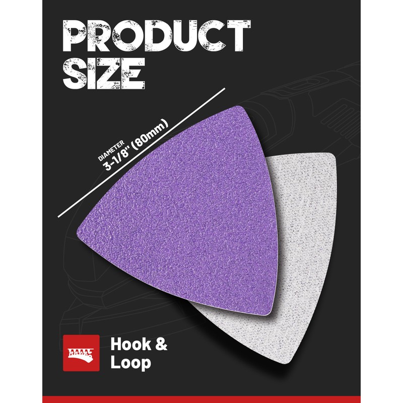 • 【Triangle Sanding Paper】The size of the triangle sanding pads is 3-1/8 inch, compatible with 3-1/8 inch oscillating multi-tool. This purple abrasive paper will not discolor the surface you are sanding, using our sandpaper can reduce losses and increase efficiency