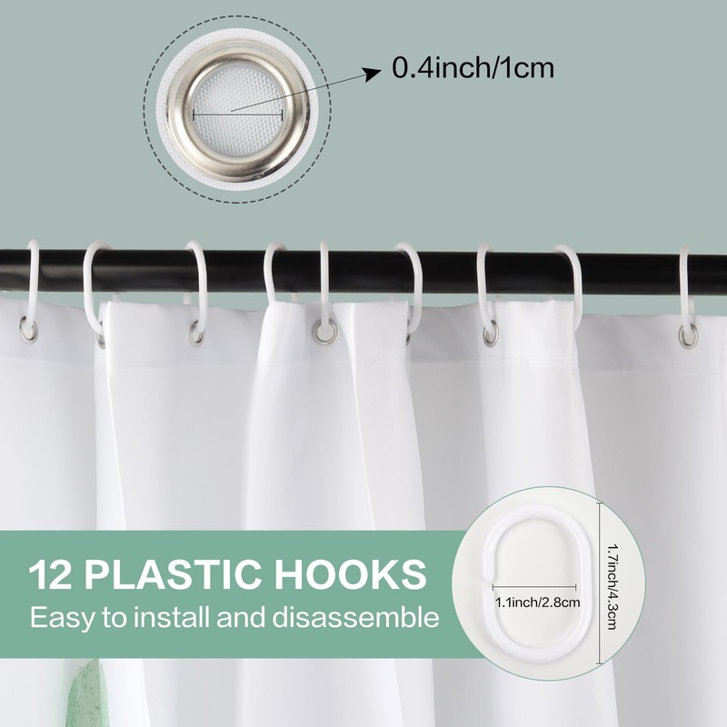 - Easy to Install: The 180cm (W) x 200cm (H) shower curtain is suitable for most bathrooms and bathtubs, and the 12 plastic hooks and metal grommet holes can ensure that the shower curtain does not fall off. Easy to install and remove, the sewn hem prevents the shower curtain from fluttering
