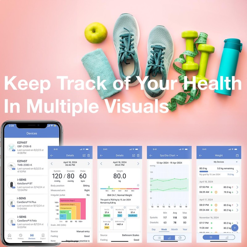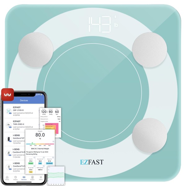 - Bluetooth Connectivity: Sync the scale with your smartphone through MedM to access all your health data in one place. The EZFAST Bluetooth Body Fat Scale Monitor allows you to track progress, set personalized goals, and monitor trends over time, keeping you motivated on your fitness journey.