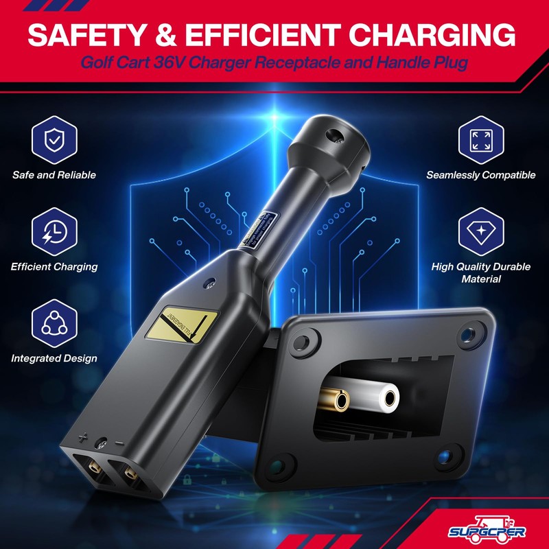 - [High Quality Material]: Golf cart charger socket and handle plug are made of high quality material, prevent wear and loose caused by frequent plugging, can withstand high temperature and long time charging pressure