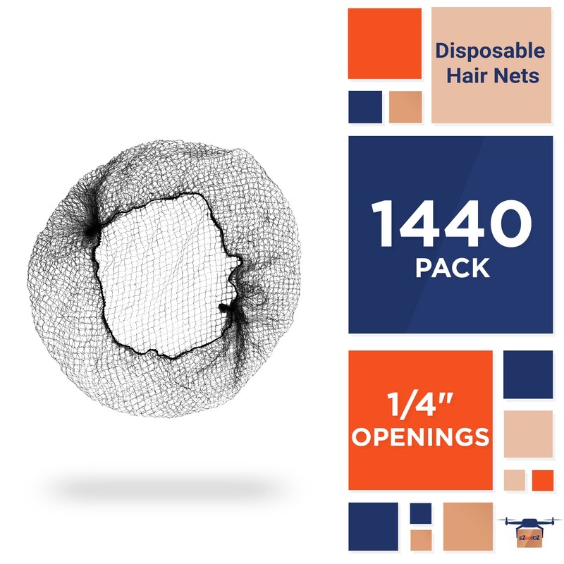 EZGOODZ Black Nylon Hair Nets 22" in Bulk. Pack of 1440 Disposable Invisible 1/4" Aperture Hairnets Caps with Elastic Band. Stretchable Head Covers for Cooking, Food Service. Lightweight, Breathable.