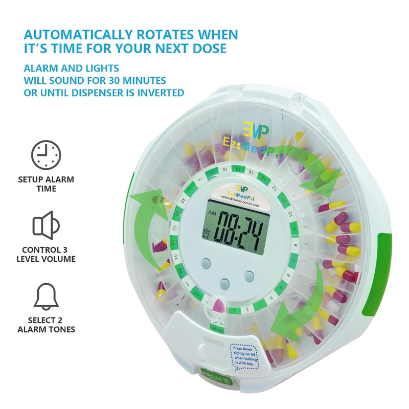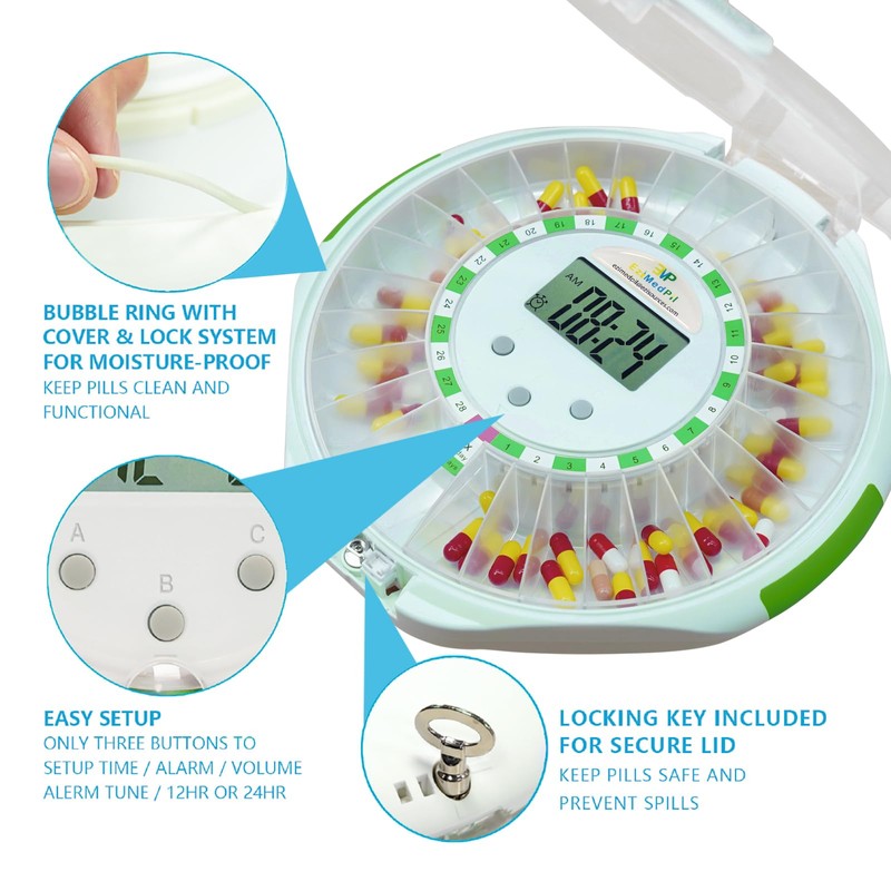 • [MEDICATION ADHERENCE MANAGEMENT--NEVER MISS OR DOUBLE DOSE] The Locked Automatic Pill Dispenser Lets Patients & Caregivers Program Dosages Up to a Maximum of 28 Consecutive Days w/ Audio & Visual Alerts 1X to 6X Daily | Allows RIGHT Patients to take RIGHT Dose & RIGHT Medications at RIGHT Time | Significantly Improving Medication Adherence Management | No Monthly Charge.