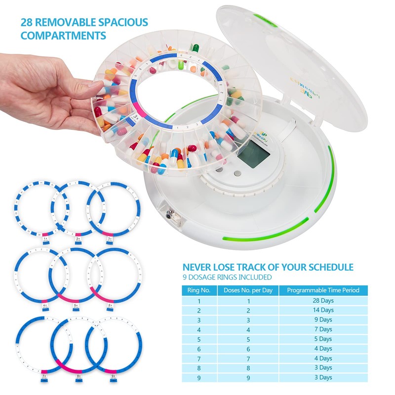 • [High-Capacity 28-Compatment & 9 INTERCHANGEABLE DOSAGE RINGS] High-Capacity 28 Slots Fit Up to 24 Aspirin-sized Tablets Which Means You Can Store up to 672 Pills! That’s 30% More Space Than Other Automatic Pill Dispensers. So You Can Easily Fit All of Your Daily Medications Each for Minimal Refills & Maximum Efficiency | 9 Templates Are Easy to Change According Patients’ Requirement | Help Improve Accuracy & Prevent Missed or Accidental Over Doses.