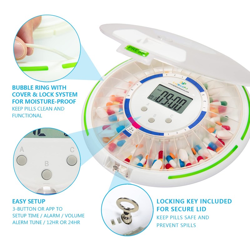 • [NEVER MISS OR DOUBLE DOSE VIA UNIT & APP SUPPORT] The Locked Bluetooth Automatic Pill Dispenser Lets Patients & Caregivers Program Dosages Up to 9X Daily & a Maximum of 28 Consecutive Days w/ Sound & Blanking Light & App Alerts| Allows RIGHT People to take RIGHT Dose & RIGHT Medications On Time | Effectively Improving Medication Adherence Management.