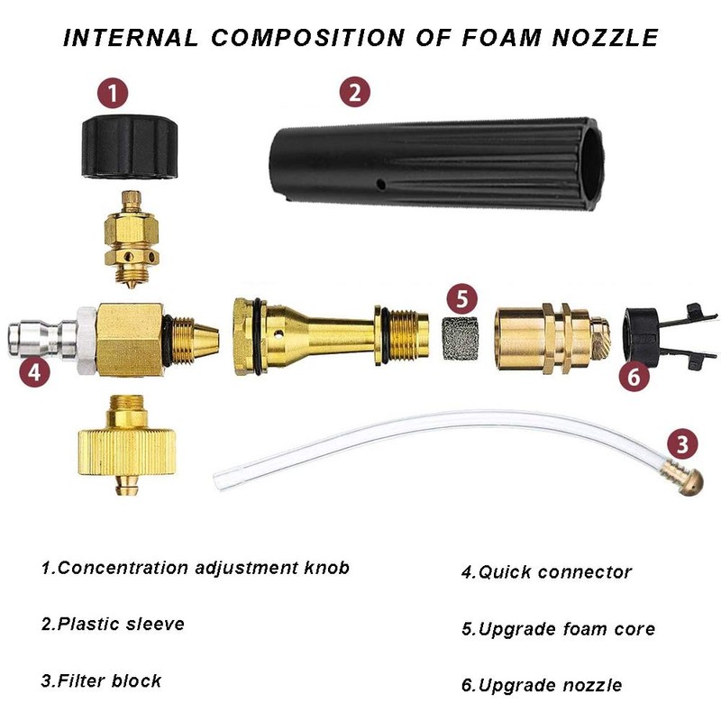 • ★Fácil de instalar: llena un poco de jabón en la botella con agua tibia para obtener espuma gruesa; luego conecta el enchufe de conexión rápida de 1/4 pulgadas a la pistola o varita de lavado a presión. Finalmente, ajusta el perilla en la parte superior al nivel de espuma deseado y luego Foam Blaster dispersará espuma gruesa. El perilla ajusta la cantidad de dispensación de espuma y la boquilla ajusta el patrón de rociado.