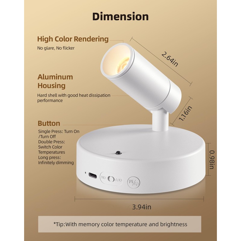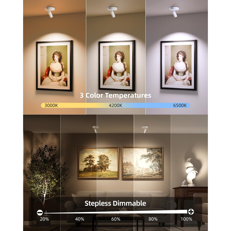 - 2.Two Control Modes: EZVALO LED spotlight indoor provides remote and button control, You can use the button on the wireless spotlight indoor to power on/off with single click, double click to cycle through color temperatures (3000K-4200K-6500K), long press for smooth dimming (10%-100%) The accent light remote control also includes a timer function (15min, 30min, 45min, 60min, 120min)