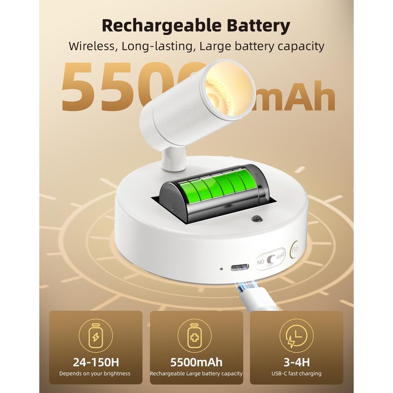 - 1.5500mAh Rechargeable Spotlight: The EZVALO plant spotlight indoor features a powerful 5500mAh rechargeable battery, Provide up to 150 hours of low brightness and 24-25 hours of high brightness lighting.Using the equipped USB-C fast charging, Battery operated spot light can be fully charged within 4 hours, providing cordless, long-lasting 100 lumens glare-free lighting,Very suitable for indoor plant lighting and picture lighting