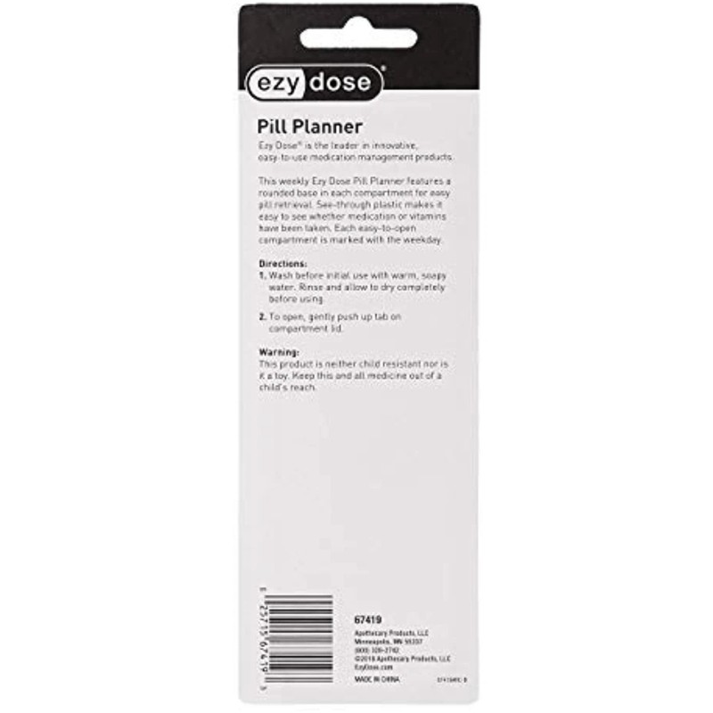 Ezy Dose Contoured Weekly Pill Planner - 7-Day Pill Reminder - This Weekly Pill Organizer is Perfect for Scheduling Your Week's Medication. It Has a Contoured Bottom for Easy Pill Removal . This 7-Day Pill Planner is designed for easy use. Its lids open with little effort and each is clearly marked with each day of the week. The main features of the Contoured Weekly Pill Planner include:Easy To Open - Lids pop open with minimal effort, Contoured Bottoms - Contoured bottoms allow for easy retrieval of medication, Large Compartments - The planner can fit 30 aspirin tablets and have plenty of room for all of your daily medications. About Ezy Dose:Ezy Dose is the leader in easy-to-use medication management products. Many of our push-button pill planners are endorsed by the Arthritis Foundation for our ease-of-use design. Ezy Dose products make living healthier simply easier with products like pill cutters, pill crushers and a full line of easy-fill planners.