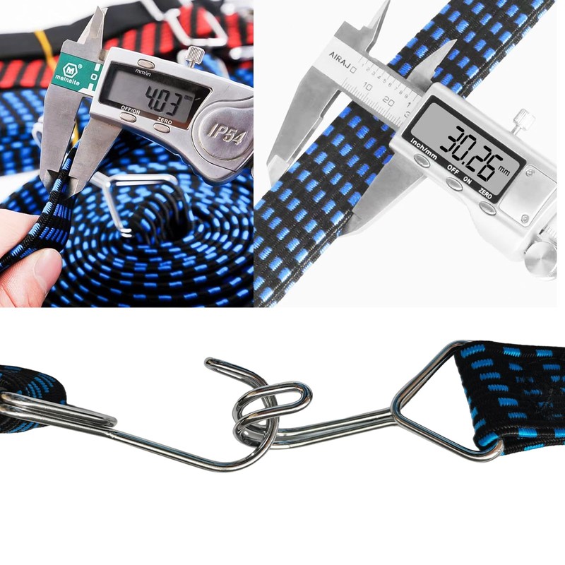 - Flat Design: 3cm width flat elastic rope is conducive to distributing the pressure to a larger surface area of the cargo. Compared to the ordinary round bungee cord, the wider flat bungee strap can hold the cargo more firmly and prevent the cargo from deforming.