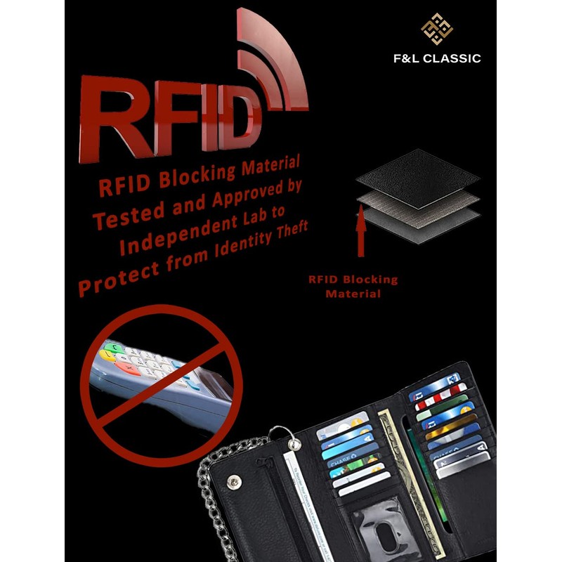 F&L CLASSIC F&L CLASSIC RFID Blocking Mens Tri-fold Long Style Cowhide Leather Steel Chain Wallet,Black