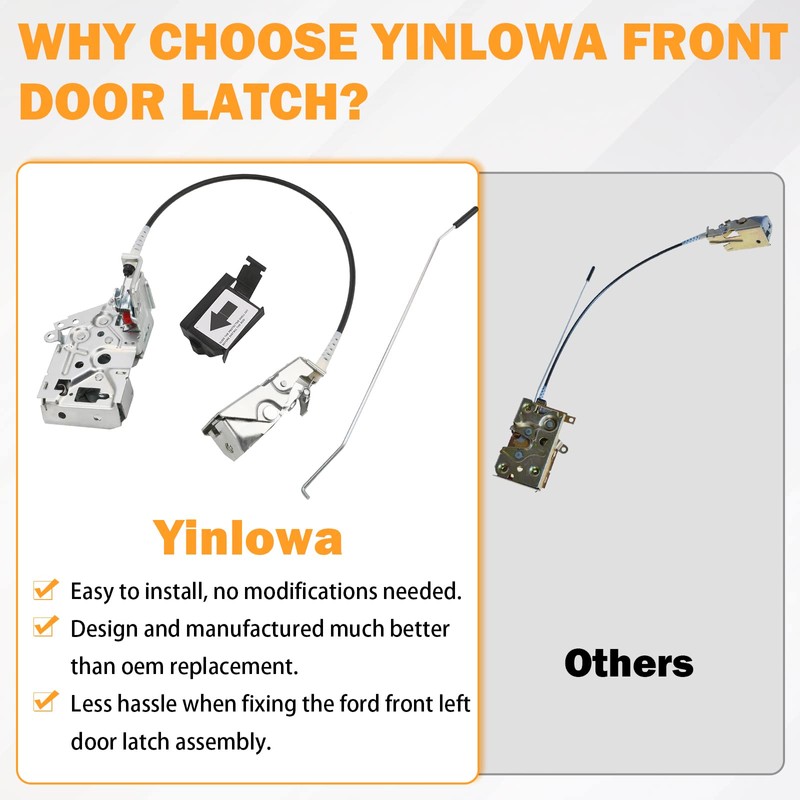 - REPLACEMENT FRONT LEFT DOOR LATCH LOCK ASSEMBLY - Help to restore the vehicle's door lock to proper operation. If the driver side door on your vehicle will not lock or unlock a bad door latch assembly is likely the problem. Order and replace a new F4TZ-15219A65-A driver side door latch cable from Yinlowa, fix annoying door lock problem on your Ford F-150 F-250 F-350 Bronco including Years 1992 1993 1994 1995 1996 1997.