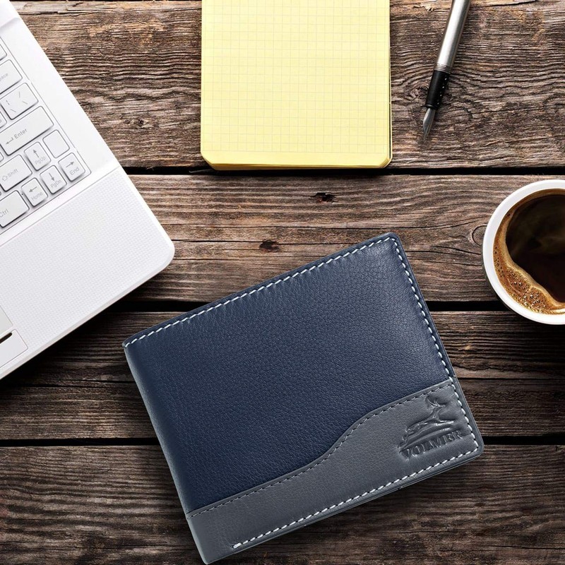 Fa.Volmer ® Manhattan Series #MW114 Genuine Leather Wallet Landscape Format with RFID Protection, Blue navy / grey, Modern
