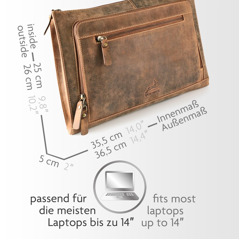 - High quality: the laptop bag is made of 100% genuine buffalo leather, lined with soft fabric on the inside and equipped with high-quality metal zips to keep your device protected. Models up to a size of 33 cm (w) x 22 cm (h) x 3 cm (d) fit comfortably in the bag.