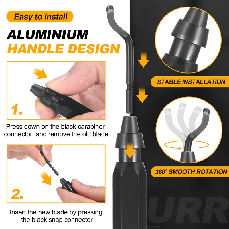 - âïž ăEasy to Install and Useă:The handle mounting head of the deburring tool adopts spring-loaded bayonet design, ensuring that the blade can be rotated 360°without falling out. The blade can be easily installed or removed by simply pressing down on the black head of the handle. The 40°bevelled blade with 360°swivel design is suitable for cutting cross holes, deep holes, round edges, straight edges, curved edges, and slots