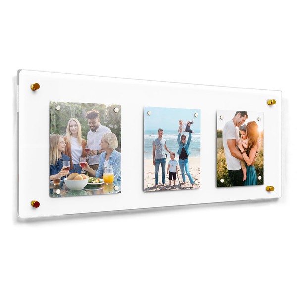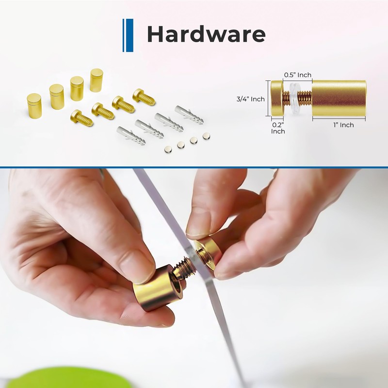 - Mounting Hardware: Package comes with four gold standoff wall mount hardware with screws, anchors and magnets. Floating acrylic frame can be hung in both horizontal and vertical layouts.