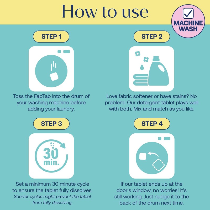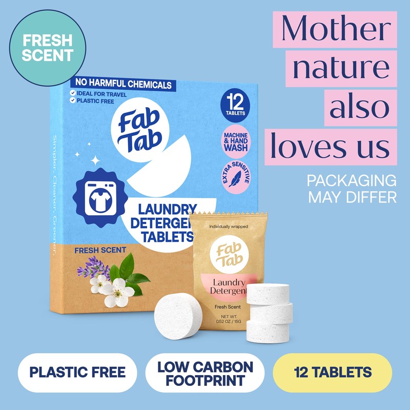 Fab Tab Natural Laundry Tabs - Plant-Based, Plastic-Free Detergent, Suitable for Kids, Pets, and All Washing Machines, Convenient Alternative to Pods and Sheets, 12 Tabs