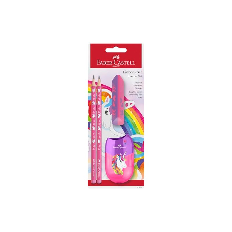 FABER-CASTELL 111518 - Unicorn writing set with HB pencils, sharpener and eraser, school set for children