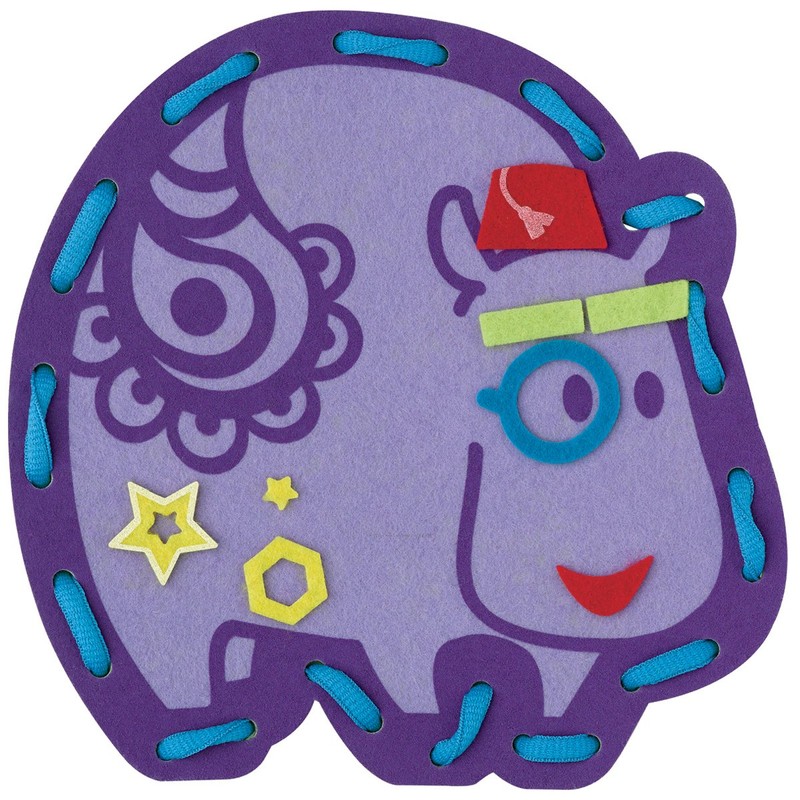 - 5 figuras de fieltro con formas de (elefante, hipopótamo, león, pulpo, oso), 5 agujetas de distintos colores para entrelazar en las figuras de fieltro y una bolsa de red para guardar el juego