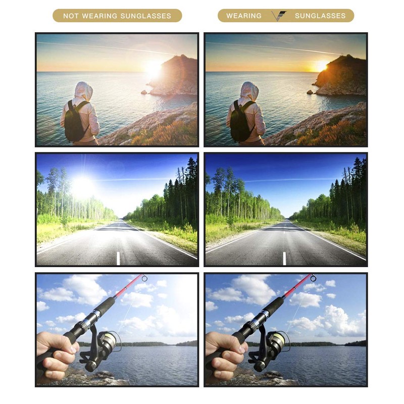 - ★Polarized Lens: Polarized sunglasses reduce glare reflected off of roads, bodies of water, snow, and other horizontal surfaces. Restore true color, eliminate reflected light and scattered light and protect eyes perfectly. Polarized sunglasses cut glare and haze so your eyes are more comfortable and keeping your eyes healthy.