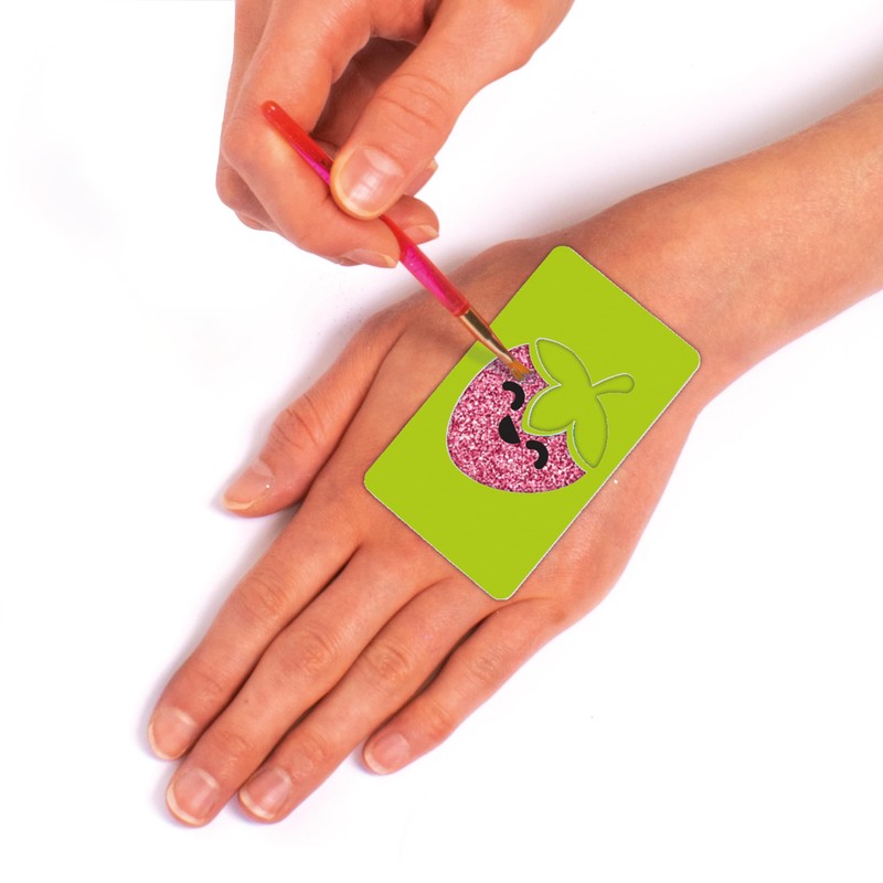• Apply colourful bio-glitter to your stencils to create cute berry-scented and shaped temporary glitter tattoos.