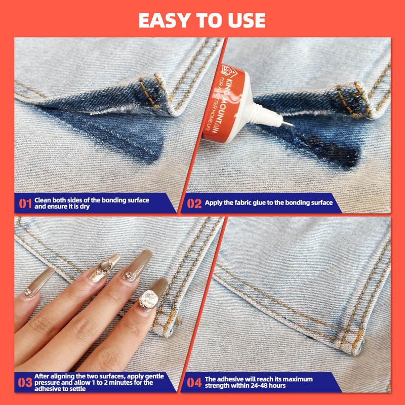 - 【Easy to Use】The kit includes a 50 ml fabric glue and a glue applicator.When using, first clean the bonding surface, evenly apply the glue to the fabric surface, then apply light pressure to bond. Wait 24-48 hours for it to cure completely and then you can wash it. (Tips: Do not open the fabric to check the bond effect before it is dry, otherwise the fabric glue will not work.)
