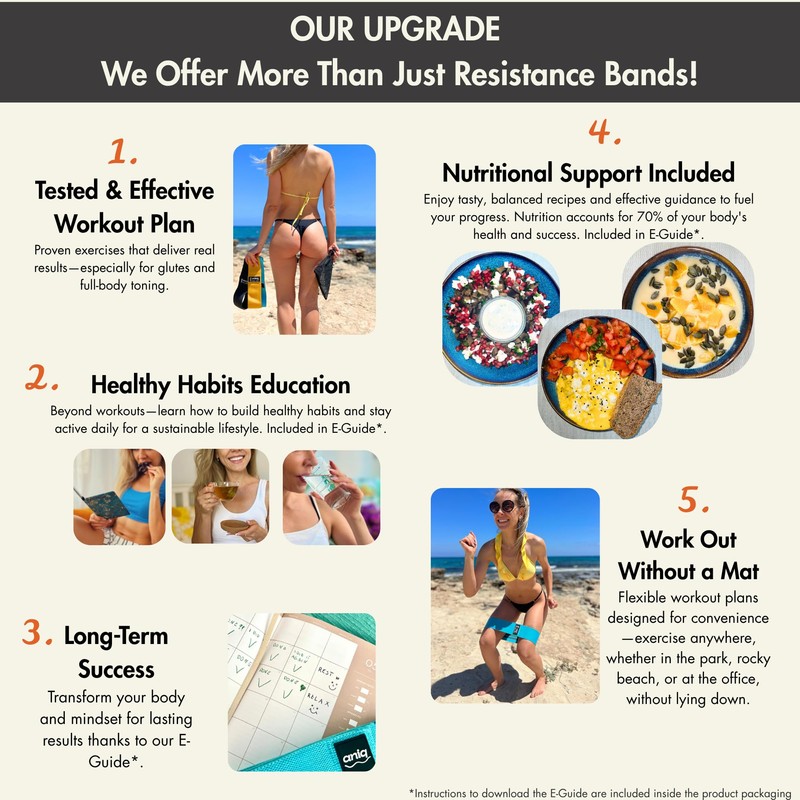 - EDUCATING - E-GUIDE INCLUDED: Access our e-guide, which offers tips and holistic approach to your fitness journey. This valuable resource helps you maximize your glute bands use while offering insights into healthy habits and delicious recipes