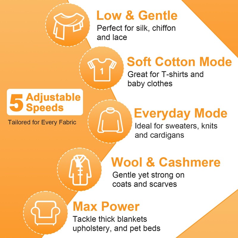 - Power for Every Fabric--This fabric shaver offers five speed settings tailored for everything from silk to wool. As a versatile lint remover and sweater shaver, it gently eliminates fuzz and pills without harming fabric fibers, restoring clothes to like-new condition