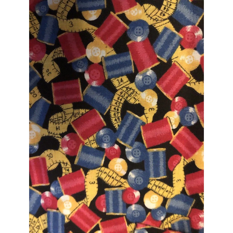 It features a multicolored design with tossed spools of thread, buttons, and a measuring tape pattern.