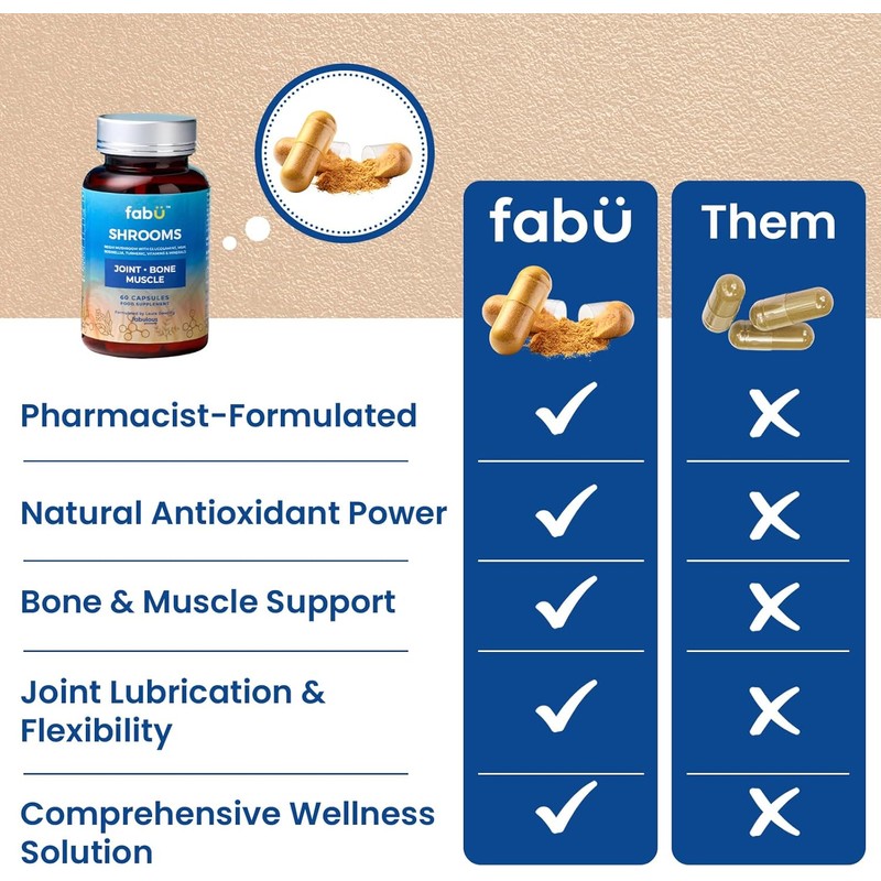 - SUPPORT JOINT HEALTH with fabÜ JOINT-BONE-MUSCLE, featuring premium glucosamine alongside powerful natural active ingredients. This unique formula combines the benefits of Reishi mushrooms with powerful nutrients, nutrients and minerals designed to support your mobility and flexibility. Perfect for individuals looking for effective joint supplements, this supplement can be an essential part of your daily wellness routine. Supports joint lubrication and movement while maintaining your active lifestyle and overall well-being. This is an ideal supplement for running, yoga, and gym work-outs.