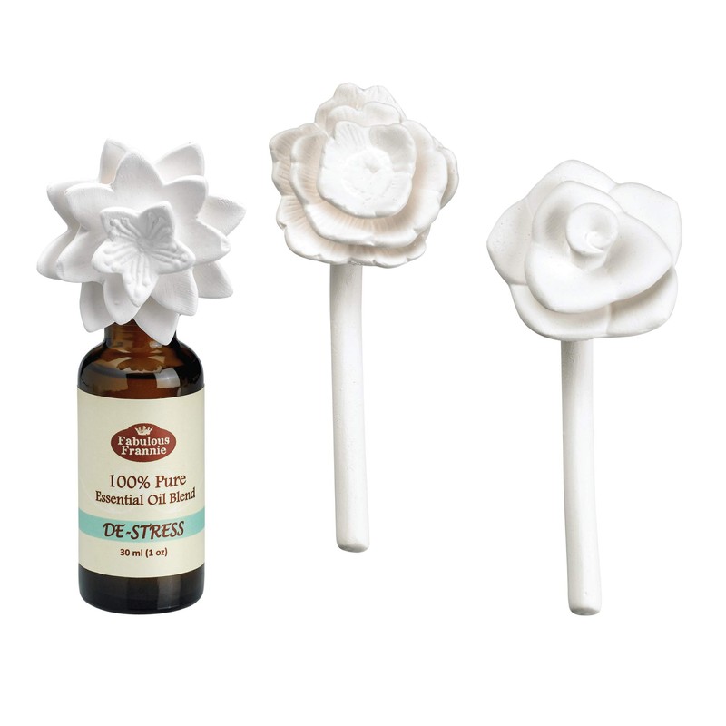 - These porous flowers allows essential oil to absorb and gently float into the air. Just place Ceramic Flower directly into De-Stress 30ml Pure Essential Oil Blend bottle to spread therapeutic aroma through any room or area size of 100-500 square feet.