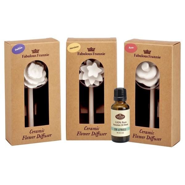 Fabulous Frannie De-Stress Aromatherapy Ceramic Flower Diffuser with 30ml Pure Essential Oil Blend made with Grapefruit, Ylang Ylang and Lavender Essential Oils 3pk Set.